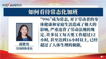 全國政協(xié)委員、編劇蔣勝男建議加強勞動法對勞動者的休息權(quán)保護,對企事業(yè)單位八小時工作制的執(zhí)行情況加強監(jiān)督管理。