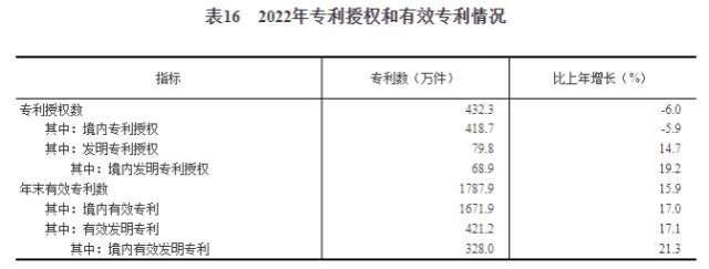 全年授予專利權(quán)432.3萬件,比上年下降6.0%;PCT專利申請(qǐng)受理量7.4萬件。截至年末,有效專利1787.9萬件,其中境內(nèi)有效發(fā)明專利328.0萬件。每萬人口高價(jià)值發(fā)明專利擁有量9.4件。全年商標(biāo)注冊(cè)617.7萬件,比上年下降20.2%。全年共簽訂技術(shù)合同77萬項(xiàng),技術(shù)合同成交金額47791億元,比上年增長28.2%。我國公民具備科學(xué)素質(zhì)的比例達(dá)到12.93%。