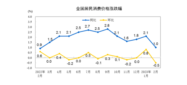 2月份居民消費(fèi)價格同比上漲1.0% 環(huán)比下降0.5%