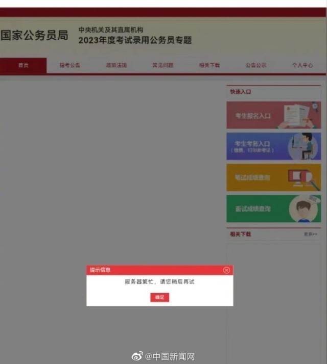 另據(jù)中新網(wǎng)報道,14日晚間,不少考生在網(wǎng)站曬出剛剛查到的2023國考筆試成績。一些網(wǎng)友反映2023國考專題網(wǎng)頁上分數(shù)查詢通道擁擠,網(wǎng)頁顯示“服務器繁忙”。