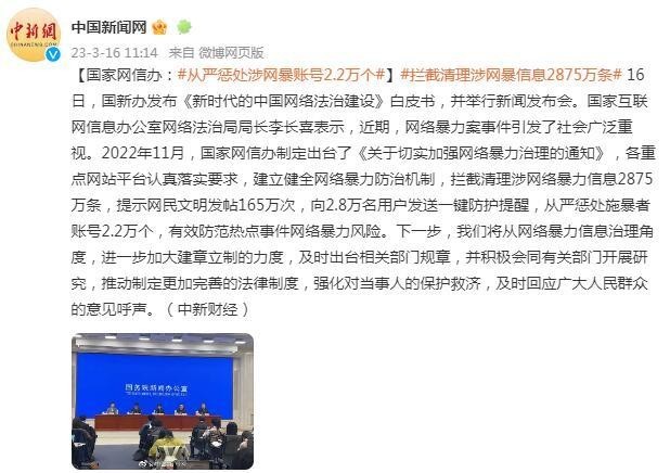國(guó)家網(wǎng)信辦:攔截清理涉網(wǎng)絡(luò)暴力信息2875萬(wàn)條,從嚴(yán)懲處涉網(wǎng)暴賬號(hào)2.2萬(wàn)個(gè)