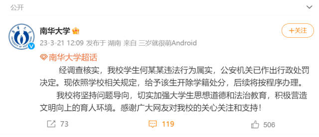 央視網消息:據@南華大學 微博最新消息,經調查核實,該校學生何某某違法行為屬實,公安機關已作出行政處罰決定。現依照學校相關規(guī)定,給予該生開除學籍處分,后續(xù)將按程序辦理。