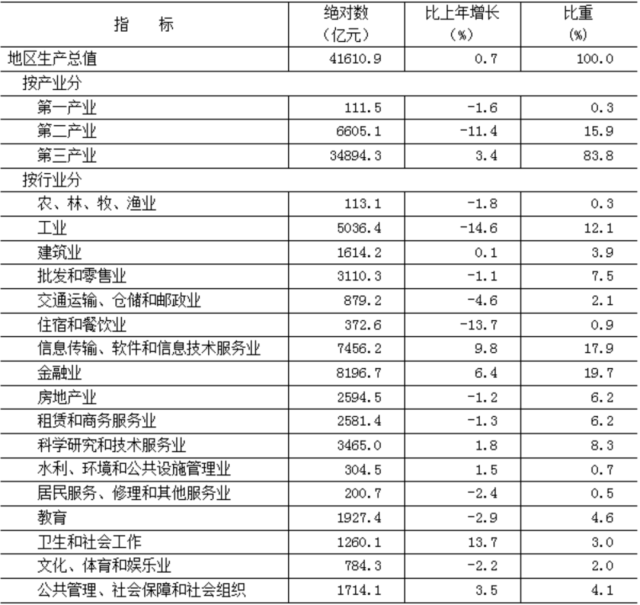 初步核算,全年實現(xiàn)地區(qū)生產(chǎn)總值41610.9億元,按不變價格計算,比上年增長0.7%。其中,第一產(chǎn)業(yè)[2]增加值111.5億元,下降1.6%;第二產(chǎn)業(yè)增加值6605.1億元,下降11.4%;第三產(chǎn)業(yè)增加值34894.3億元,增長3.4%。三次產(chǎn)業(yè)構(gòu)成為0.3︰15.9︰83.8。按常住人口計算,全市人均地區(qū)生產(chǎn)總值為19.0萬元。