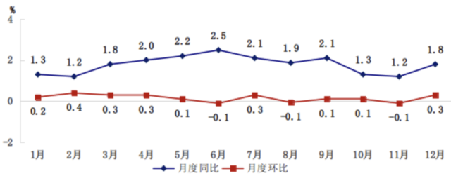 全年居民消費價格總水平比上年上漲1.8%。工業(yè)生產(chǎn)者出廠價格上漲2.3%,工業(yè)生產(chǎn)者購進價格上漲6.2%。農(nóng)產(chǎn)品生產(chǎn)者價格上漲2.7%。12月份,新建商品住宅銷售價格環(huán)比指數(shù)為100.2、同比指數(shù)為105.8;二手住宅銷售價格環(huán)比指數(shù)為99.6、同比指數(shù)為103.9。