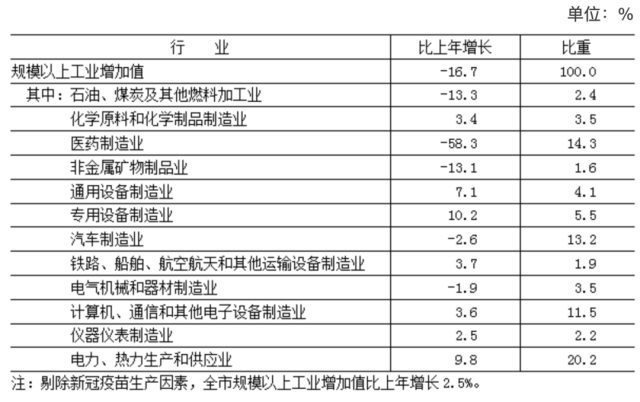 全年實現(xiàn)工業(yè)增加值5036.4億元,按不變價格計算,比上年下降14.6%。其中,規(guī)模以上工業(yè)[4]增加值下降16.7%,剔除新冠疫苗生產(chǎn)因素增長2.5%。在規(guī)模以上工業(yè)中,電力、熱力生產(chǎn)和供應(yīng)業(yè)增長9.8%,計算機、通信和其他電子設(shè)備制造業(yè)增長3.6%,汽車制造業(yè)下降2.6%,醫(yī)藥制造業(yè)下降58.3%(剔除新冠疫苗生產(chǎn)因素后增長6.4%)。規(guī)模以上工業(yè)實現(xiàn)銷售產(chǎn)值22366.3億元,下降5.7%。其中,內(nèi)銷產(chǎn)值20560.5億元,下降1.8%;出口交貨值1805.8億元,下降35.0%。