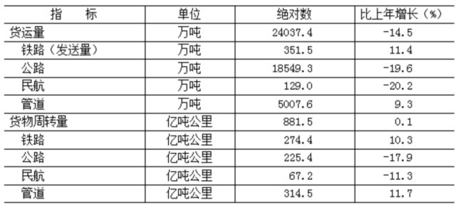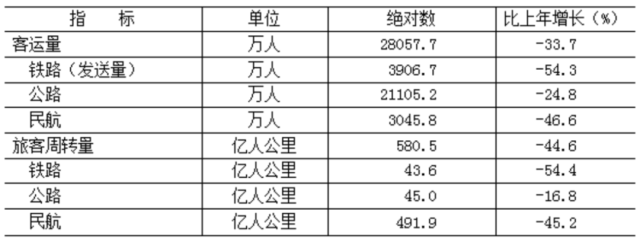 全年貨運量24037.4萬噸,比上年下降14.5%;貨物周轉(zhuǎn)量881.5億噸公里,增長0.1%。全年客運量28057.7萬人,下降33.7%;旅客周轉(zhuǎn)量580.5億人公里,下降44.6%。