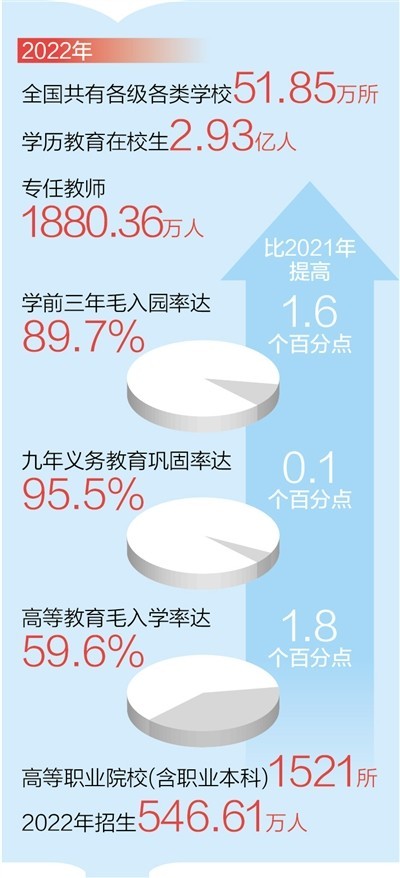 ——普及鞏固水平進一步提升。全國學前三年毛入園率達到89.7%,比2021年提高1.6個百分點;九年義務(wù)教育鞏固率達95.5%,高中階段毛入學率達到91.6%。