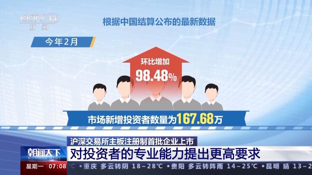根據(jù)中國結(jié)算公布的最新數(shù)據(jù),今年2月,市場新增投資者數(shù)量為167.68萬,環(huán)比增加98.48%,這是時隔4個月之后,市場單月新增投資者數(shù)量再次超過百萬。截至2月末,我國A股投資者已達(dá)到2.14億。專家表示,全面實行注冊制,一些市場規(guī)則隨之調(diào)整,投資者需要審慎進(jìn)行判斷。