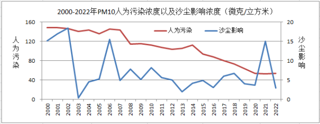 2000-2022年P(guān)M10人為污染濃度以及沙塵影響濃度變化圖。圖片來(lái)源:北京市生態(tài)環(huán)境監(jiān)測(cè)中心