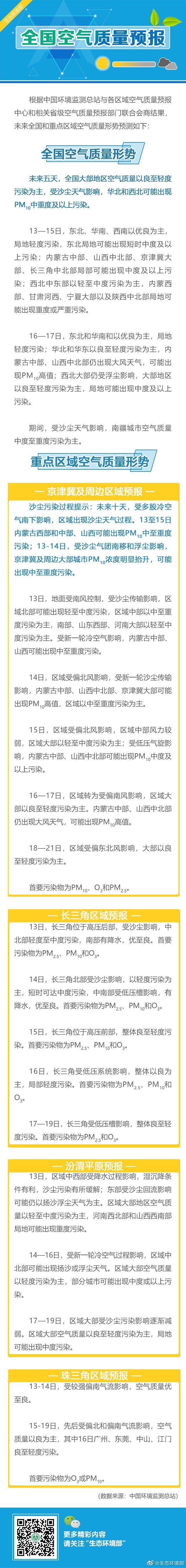 央視網(wǎng)消息:據(jù)@生態(tài)環(huán)境部 微博消息,未來五天(4月13—17日),全國大部地區(qū)空氣質(zhì)量以良至輕度污染為主,受沙塵天氣影響,華北和西北可能出現(xiàn)PM10中重度及以上污染。