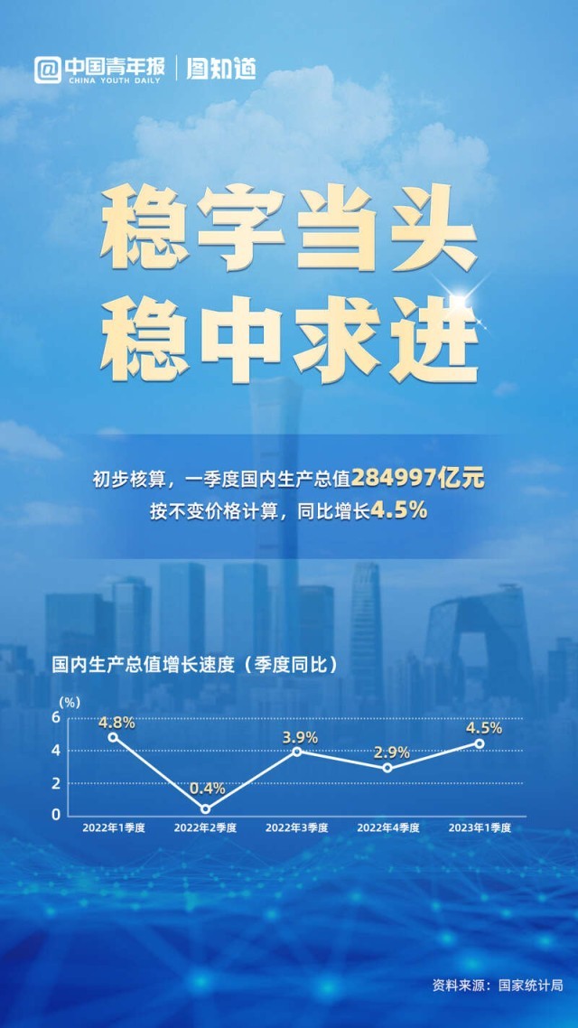 4月18日上午,國家統(tǒng)計局新聞發(fā)言人、國民經(jīng)濟(jì)綜合統(tǒng)計司司長付凌暉在介紹2023年一季度國民經(jīng)濟(jì)運(yùn)行情況時說,初步核算,一季度國內(nèi)生產(chǎn)總值284997億元,按不變價格計算,同比增長4.5%。一季度,面對嚴(yán)峻復(fù)雜的國際環(huán)境和艱巨繁重的國內(nèi)改革發(fā)展穩(wěn)定任務(wù),我國走出穩(wěn)字當(dāng)頭、穩(wěn)中求進(jìn)的經(jīng)濟(jì)運(yùn)行開局態(tài)勢。