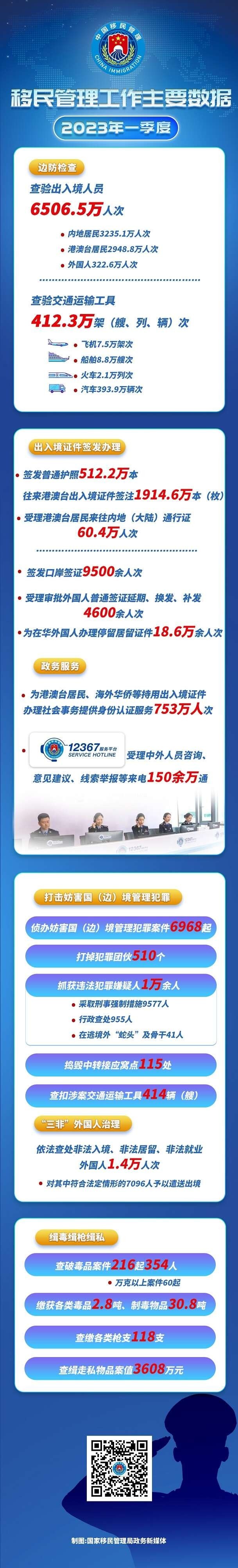 一季度,全國(guó)移民管理機(jī)構(gòu)查驗(yàn)交通運(yùn)輸工具412.3萬(wàn)架(艘、列、輛)次,其中飛機(jī)7.5萬(wàn)架次,船舶8.8萬(wàn)艘次,火車2.1萬(wàn)列次,汽車393.9萬(wàn)輛次;簽發(fā)普通護(hù)照512.2萬(wàn)本、往來(lái)港澳臺(tái)出入境證件簽注1914.6萬(wàn)本(枚),受理港澳臺(tái)居民來(lái)往內(nèi)地(大陸)通行證60.4萬(wàn)人次;簽發(fā)口岸簽證9500余人次,受理審批外國(guó)人普通簽證延期、換發(fā)、補(bǔ)發(fā)4600余人次,為在華外國(guó)人辦理停留居留證件18.6萬(wàn)余人次;為港澳臺(tái)居民、海外華僑等持用出入境證件辦理社會(huì)事務(wù)提供身份認(rèn)證服務(wù)753萬(wàn)人次,12367服務(wù)平臺(tái)受理中外人員咨詢、意見(jiàn)建議、線索舉報(bào)等來(lái)電150余萬(wàn)通。