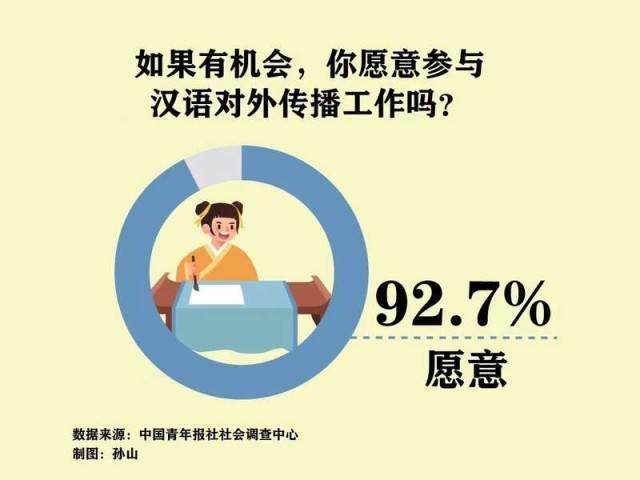 在4月20日聯(lián)合國(guó)中文日到來(lái)之際,中國(guó)青年報(bào)社社會(huì)調(diào)查中心聯(lián)合問(wèn)卷網(wǎng)(wenjuan.com),對(duì)2002名受訪(fǎng)青年進(jìn)行的一項(xiàng)調(diào)查顯示,81.6%的受訪(fǎng)青年認(rèn)為漢語(yǔ)熱下,對(duì)外漢語(yǔ)工作者的需求量會(huì)增加。92.7%的受訪(fǎng)青年明確表示如果有機(jī)會(huì),愿意參與漢語(yǔ)對(duì)外傳播工作。