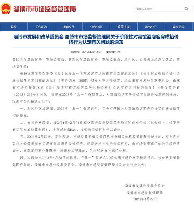根據(jù)國家發(fā)展改革委《關(guān)于做好五一假期旅游市場價格有關(guān)工作的通知》《關(guān)于構(gòu)成哄抬價格行為漲價幅度界定問題的意見》(魯價調(diào)發(fā)〔2005〕65號)等文件規(guī)定,經(jīng)山東省發(fā)展和改革委員會、山東省市場監(jiān)督管理局《關(guān)于淄博市賓館酒店客房哄抬價格行為認(rèn)定有關(guān)問題的批復(fù)》(魯發(fā)改價格〔2023〕294號)同意,我市在2023年“五一”假期前后,對賓館酒店客房價格實行漲價幅度控制措施,現(xiàn)就有關(guān)問題通知如下: