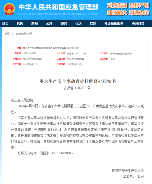 國(guó)務(wù)院安委會(huì)決定對(duì)浙江金華一廠房重大火災(zāi)事故查處實(shí)行掛牌督辦