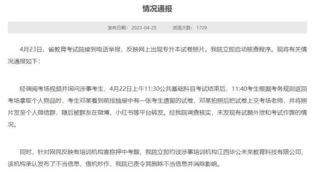 經(jīng)調(diào)閱考場視頻并詢問涉事考生,4月22日上午11:30公共基礎(chǔ)科目考試結(jié)束后,11:40考生根據(jù)考務(wù)規(guī)則返回考場拿取個(gè)人物品時(shí),考生鄧某看到前排抽屜中有一張考生遺留的試卷,鄧某拍照后把試卷上交考場老師,并將照片發(fā)至個(gè)人微信群,隨后被群友在微博、小紅書等平臺轉(zhuǎn)發(fā)。經(jīng)江西省教育考試院調(diào)查核實(shí),未發(fā)現(xiàn)有試題外泄和考試作弊的情況。