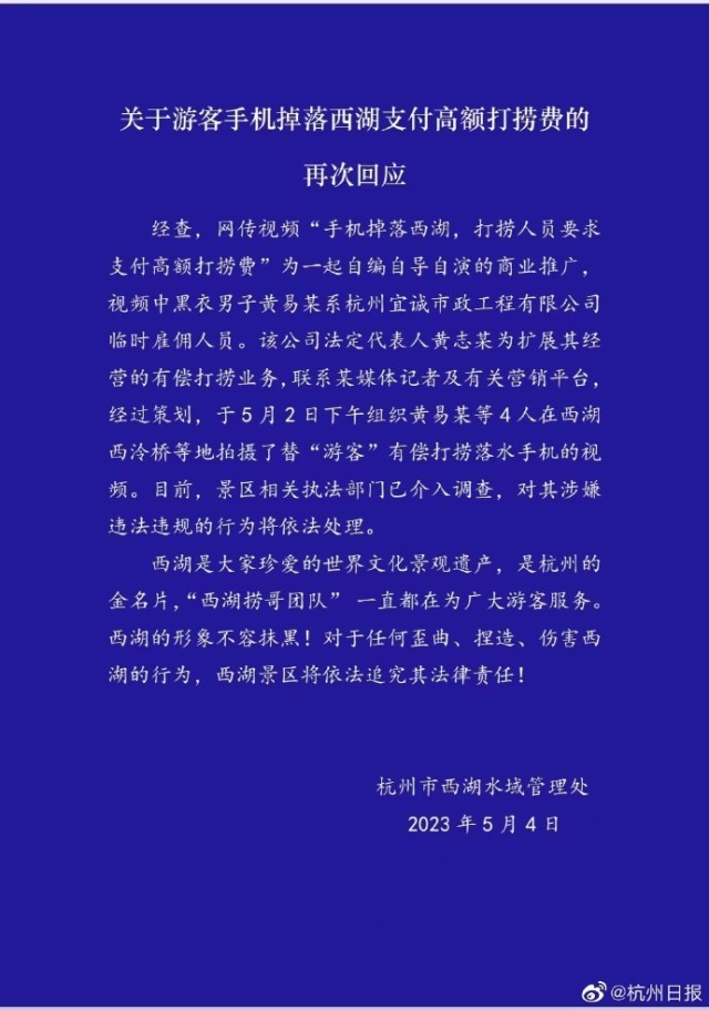 5月4日,杭州西湖水域管理處再次回應“高價撈手機事件”:經(jīng)查,網(wǎng)傳視頻“手機掉落西湖,打撈人員要求支付高額打撈費”為一起自編自導自演的商業(yè)推廣,視頻中黑衣男子黃易某系杭州宜誠市政工程有限公司臨時雇傭人員。該公司法定代表人黃志某為擴展其經(jīng)營的有償打撈業(yè)務(wù),聯(lián)系某媒體記者及有關(guān)營銷平臺經(jīng)過策劃,于5月2日下午組織黃易某等4人在西湖西冷橋等地拍攝了替“游客”有償打撈落水手機的視頻。目前,景區(qū)相關(guān)執(zhí)法部門已介入調(diào)查,對其涉嫌違法違規(guī)的行為將依法處理。西湖是大家珍愛的世界文化景觀遺產(chǎn),是杭州的金名片,“西湖撈哥團隊”一直都在為廣大游客服務(wù)。西湖的形象不容抹黑!對于任何歪曲、捏造、傷害西湖的行為,西湖景區(qū)將依法追究其法律責任!