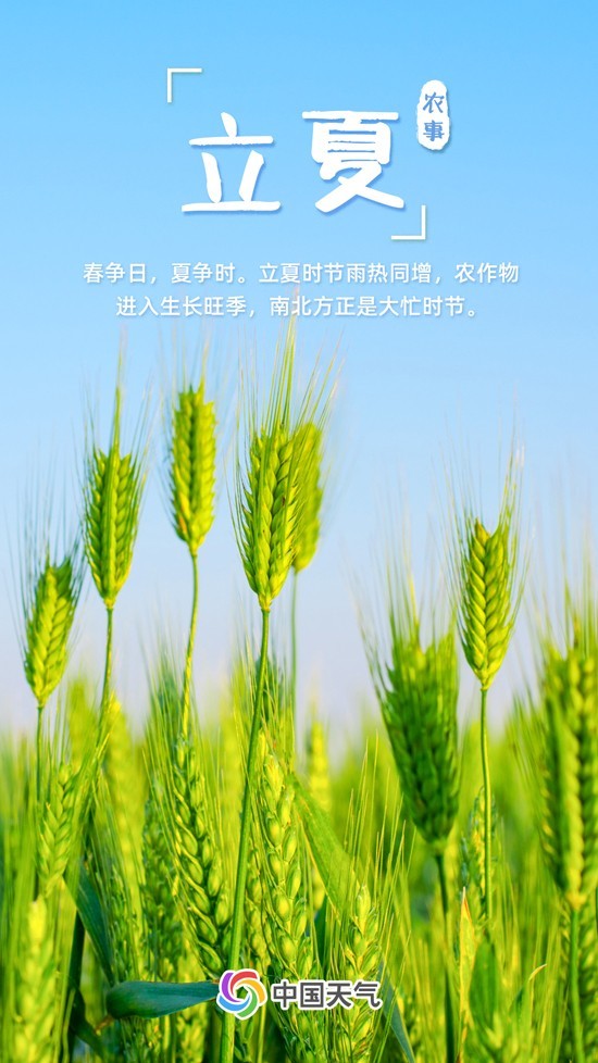 如果說春是生的季節(jié),那么夏就是長的季節(jié)?!稓v書》曰:“斗指東南,維為立夏,萬物至此皆長大,故名立夏也?!绷⑾模菢?biāo)示萬物進入旺季生長的一個重要節(jié)氣。此時,日照增加、氣溫漸升、雷雨增多,農(nóng)作物進入了茁壯成長階段。春播作物漸漸長大,夏收作物進入生長后期,冬小麥揚花灌漿,油菜接近成熟,大江南北都進入了農(nóng)事繁忙時期。
