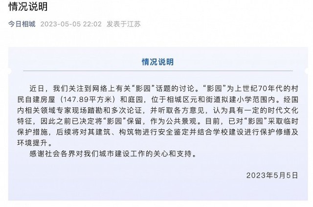 央視網(wǎng)消息:蘇州相城區(qū)委宣傳部公眾號“今日相城”5月5日發(fā)布情況說明稱,近日關(guān)注到網(wǎng)絡(luò)上有關(guān)“影園”話題的討論?!坝皥@”為上世紀(jì)70年代的村民自建房屋(147.89平方米)和庭園,位于相城區(qū)元和街道擬建小學(xué)范圍內(nèi)。經(jīng)國內(nèi)相關(guān)領(lǐng)域?qū)<椰F(xiàn)場踏勘和多次論證,并聽取各方意見,認(rèn)為具有一定的時代文化特征,因此之前已決定將“影園”保留,作為公共景觀。目前,已對“影園”采取臨時保護(hù)措施,后續(xù)將對其建筑、構(gòu)筑物進(jìn)行安全鑒定并結(jié)合學(xué)校建設(shè)進(jìn)行保護(hù)修繕及環(huán)境提升。