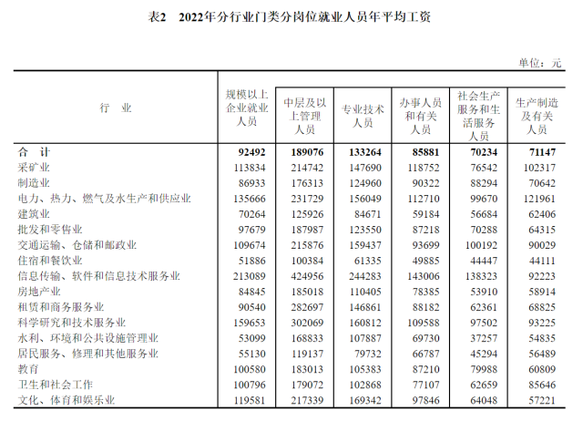 2022年分行業(yè)門(mén)類(lèi)分崗位就業(yè)人員年平均工資。來(lái)源:國(guó)家統(tǒng)計(jì)局