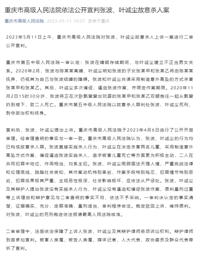 宣判后,張波、葉誠(chéng)塵提出上訴。重慶市高級(jí)人民法院于2023年4月6日進(jìn)行了公開開庭審理。經(jīng)審理查明的事實(shí)與一審一致。重慶市高級(jí)人民法院認(rèn)為,張波、葉誠(chéng)塵的行為均已構(gòu)成故意殺人罪。張波直接實(shí)施殺人行為,葉誠(chéng)塵在決定殺害兩名兒童、采用制造意外高墜方式作案、催促逼迫張波實(shí)施殺人、追求被害兒童死亡等方面更為積極主動(dòng),二人在共同犯罪中地位、作用相當(dāng),均系主犯。張波、葉誠(chéng)塵罔顧國(guó)法天理人情,嚴(yán)重挑戰(zhàn)法律和倫理底線、踐踏社會(huì)良知,其作案動(dòng)機(jī)特別卑劣,作案手段特別殘忍,犯罪情節(jié)特別惡劣,犯罪后果極其嚴(yán)重,主觀惡性極深,社會(huì)影響極壞,應(yīng)依法從嚴(yán)懲處。張波、葉誠(chéng)塵及其辯護(hù)人提出張波沒有實(shí)施殺人行為、葉誠(chéng)塵沒有逼迫和催促?gòu)埐ㄗ靼?、原判量刑過重等上訴理由和辯護(hù)意見與二審查明的事實(shí)不符,依法不予采納。一審判決認(rèn)定的事實(shí)清楚,證據(jù)確實(shí)、充分,定罪準(zhǔn)確,量刑適當(dāng),審判程序合法。裁定駁回上訴,維持原判。對(duì)張波、葉誠(chéng)塵的死刑裁定依法報(bào)請(qǐng)最高人民法院核準(zhǔn)。