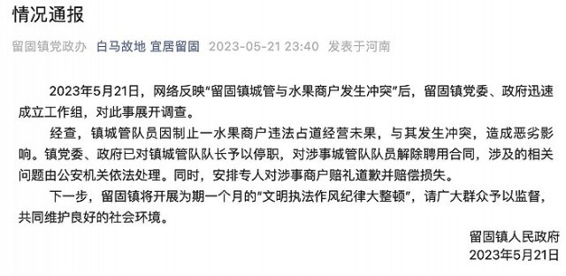 城管與水果商戶沖突?河南留固鎮(zhèn):涉事城管隊隊長停職、隊員解除合同