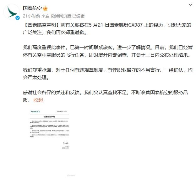 23日,國(guó)泰再次發(fā)聲明稱,已第一時(shí)間聯(lián)系旅客,目前已經(jīng)暫停有關(guān)乘務(wù)員的飛行任務(wù),即時(shí)展開內(nèi)部調(diào)查,并會(huì)于三日內(nèi)公布處理結(jié)果。