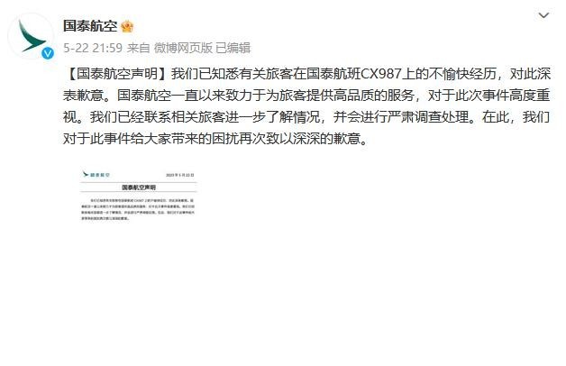 22日晚,國(guó)泰航空發(fā)聲明稱,已知悉有關(guān)旅客在CX987航班上的不愉快經(jīng)歷,公司對(duì)此深表歉意,并聯(lián)系相關(guān)旅客進(jìn)一步了解情況,會(huì)進(jìn)行嚴(yán)肅調(diào)查處理。