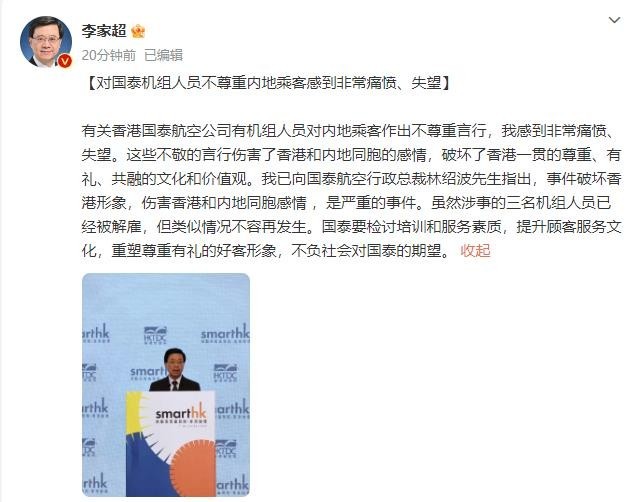 李家超表示,他已向國(guó)泰航空行政總裁林紹波提出,此次事件屬于嚴(yán)重事件,國(guó)泰航空需進(jìn)行檢討,類似情況不容再次發(fā)生。