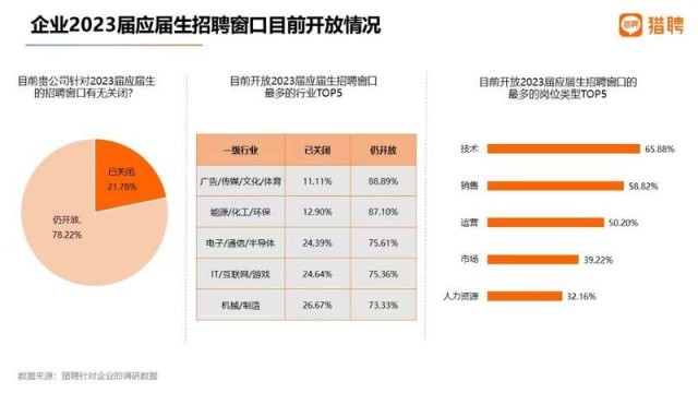 中國青年報客戶端訊(中青報·中青網(wǎng)記者 朱彩云)臨近畢業(yè)季,獵聘大數(shù)據(jù)研究院日前推出的《2023屆高校畢業(yè)生就業(yè)數(shù)據(jù)報告》顯示,目前有78.22%的企業(yè)仍開放校招窗口,其中廣告/傳媒/文化/教育、能源/化工/環(huán)保行業(yè)的企業(yè)占比分別達(dá)88.89%、87.1%。在招崗位中,技術(shù)、銷售和運營類需求量位居前三。