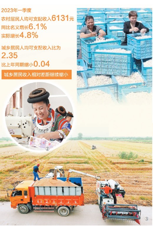 國家統(tǒng)計局發(fā)布的數(shù)據(jù)顯示,去年農(nóng)村居民人均可支配收入首次邁上2萬元這個新臺階,城鄉(xiāng)居民收入相對差距持續(xù)縮小。今年一季度,農(nóng)村居民人均可支配收入繼續(xù)保持增長勢頭,同比名義增長6.1%,實(shí)際增長4.8%,比去年全年提高0.6個百分點(diǎn)。