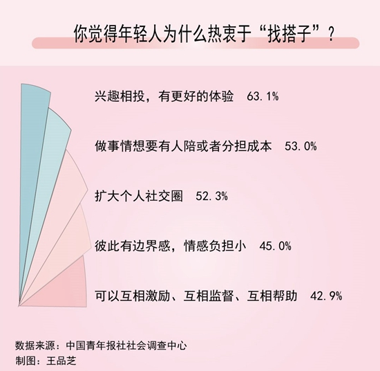 近日,中國(guó)青年報(bào)社社會(huì)調(diào)查中心聯(lián)合問卷網(wǎng)(wenjuan.com),對(duì)1335名受訪者進(jìn)行的一項(xiàng)調(diào)查顯示,63.1%的受訪青年認(rèn)為找“搭子”是因?yàn)榕d趣相投,有更好的體驗(yàn),53.0%的青年覺得是因?yàn)樽鍪虑橄胍腥伺慊蛘叻謸?dān)成本。