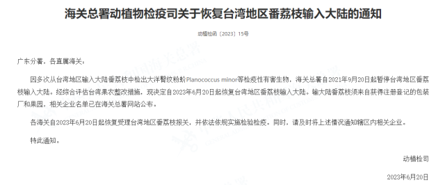 各海關(guān)自2023年6月20日起恢復(fù)受理臺灣地區(qū)番荔枝報關(guān),并依法依規(guī)實(shí)施檢驗檢疫。同時,請及時將上述情況通知轄區(qū)內(nèi)相關(guān)企業(yè)。