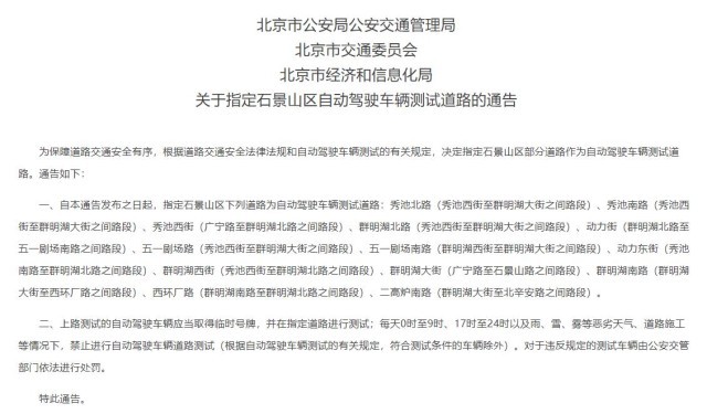 為保障道路交通安全有序,根據(jù)道路交通安全法律法規(guī)和自動駕駛車輛測試的有關(guān)規(guī)定,決定指定石景山區(qū)部分道路作為自動駕駛車輛測試道路。