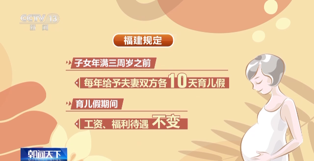 福建規(guī)定,子女年滿三周歲之前,每年給予夫妻雙方各10天育兒假,育兒假期間,工資、福利待遇不變。