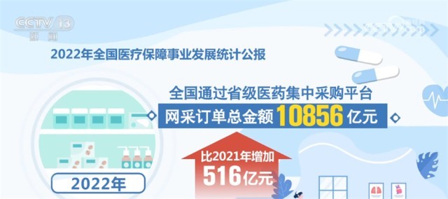 在藥品和耗材集采方面,2022年,第七批國家組織藥品集中帶量采購涉及61個品種,平均降價48%。國家組織骨科脊柱類高值醫(yī)用耗材集采納入5種脊柱類骨科耗材,平均降幅84%。根據(jù)公報,2022年,全國通過省級醫(yī)藥集中采購平臺網(wǎng)采訂單總金額10856億元,比2021年增加516億元。其中,西藥(化學藥及生物制品)8810億元,中成藥2046億元,分別比2021年增加495億元和21億元。群眾用上了更多質(zhì)優(yōu)價宜的藥品和耗材。