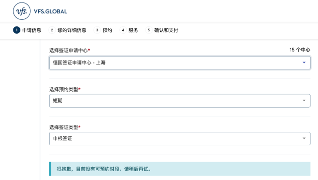 如在威孚仕官網(wǎng),在國內(nèi)多個城市的德國簽證申請中心申請短期申根簽證都顯示“目前沒有可預(yù)約時段”。