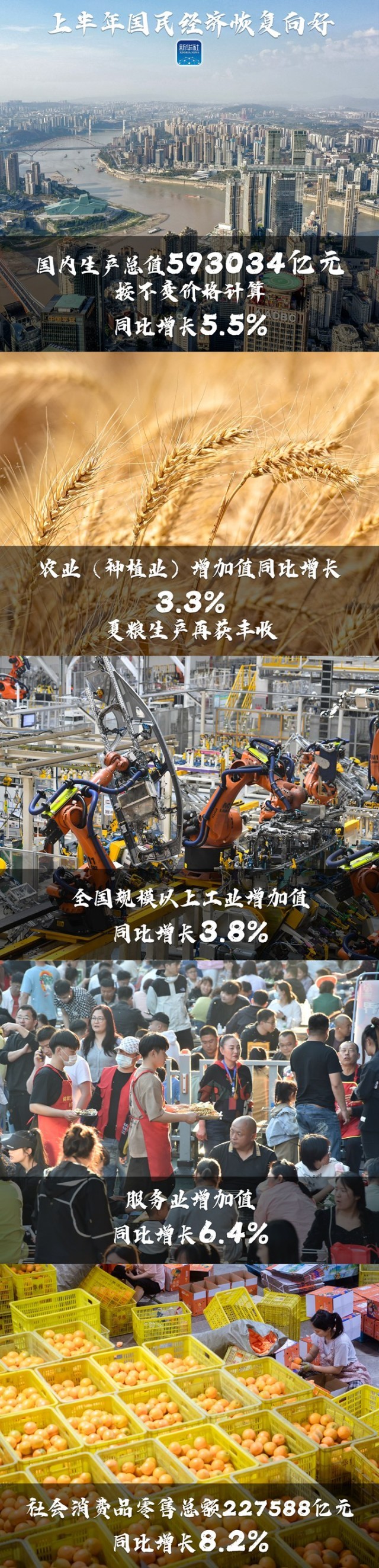 國家統(tǒng)計局7月17日發(fā)布數(shù)據(jù),今年上半年國內(nèi)生產(chǎn)總值(GDP)593034億元,按不變價格計算,同比增長5.5%。上半年,面對復雜嚴峻的國際環(huán)境和艱巨繁重的國內(nèi)改革發(fā)展穩(wěn)定任務,各地區(qū)各部門突出做好穩(wěn)增長、穩(wěn)就業(yè)、穩(wěn)物價工作,市場需求逐步恢復,生產(chǎn)供給持續(xù)增加,經(jīng)濟運行整體回升向好。