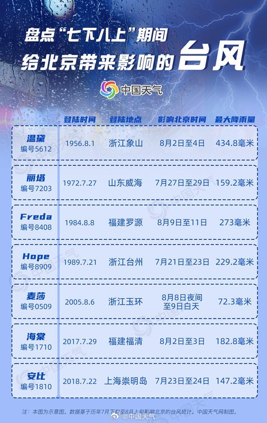 本次極端降水過程中,臺風(fēng)“杜蘇芮”的殘余環(huán)流北上是其中一個重要的原因。歷史上北京也曾多次受到臺風(fēng)及其減弱后的低壓影響,出現(xiàn)較強降雨。例如2017年第10號臺風(fēng)“海棠”和2018年第10號臺風(fēng)“安比”給北京帶來的最大降雨量都超過了100毫米,更早的1956年第12號臺風(fēng)“溫黛”導(dǎo)致的最大降雨量更是超過400毫米。