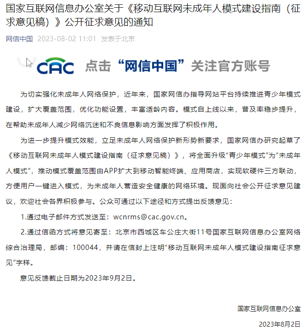 國(guó)家互聯(lián)網(wǎng)信息辦公室關(guān)于《移動(dòng)互聯(lián)網(wǎng)未成年人模式建設(shè)指南(征求意見(jiàn)稿)》公開(kāi)征求意見(jiàn)的通知