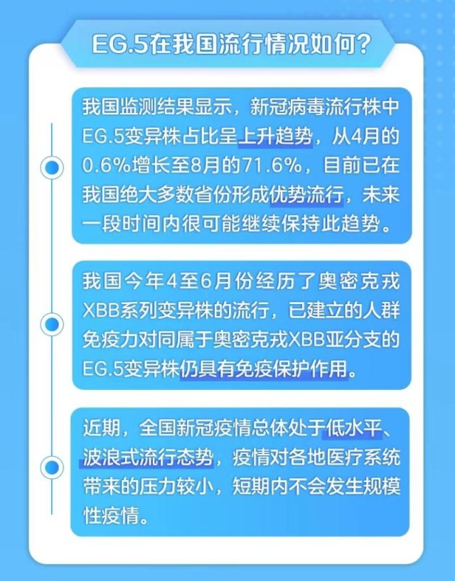 部分公眾關(guān)心EG.5是否會(huì)引發(fā)新一輪的廣泛流行。對(duì)此,國(guó)家疾控局表示,我國(guó)今年4至6月份經(jīng)歷了奧密克戎XBB系列變異株的流行,已建立的人群免疫力對(duì)同屬于奧密克戎XBB亞分支的EG.5變異株仍具有免疫保護(hù)作用,短期內(nèi)不會(huì)發(fā)生規(guī)模性疫情。