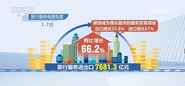 旅行服務明顯恢復。1月—7月,旅行服務進出口7681.3億元,同比增長66.2%,繼續(xù)成為增長最快的服務貿(mào)易領域。其中,出口增長55.8%、進口增長67%。