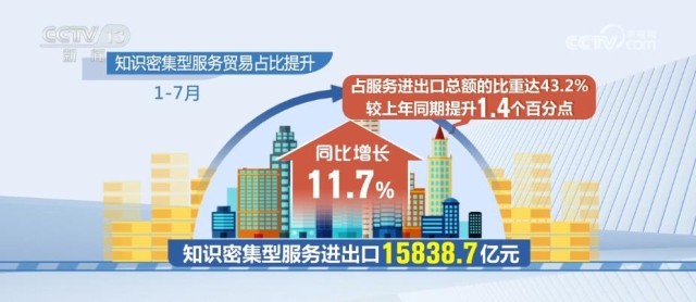 知識密集型服務貿(mào)易占比提升。1月—7月,知識密集型服務進出口15838.7億元,同比增長11.7%,占服務進出口總額的比重達43.2%,較上年同期提升1.4個百分點。