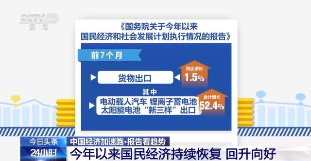 報告指出,前7個月貨物出口同比增長1.5%,其中電動載人汽車、鋰離子蓄電池、太陽能電池“新三樣”出口合計增長52.4%。知識密集型服務貿易較快增長,旅行服務貿易明顯恢復,上半年服務進出口同比增長8.5%。推動外資標志性項目落地實施,外貿外資平穩(wěn)發(fā)展。