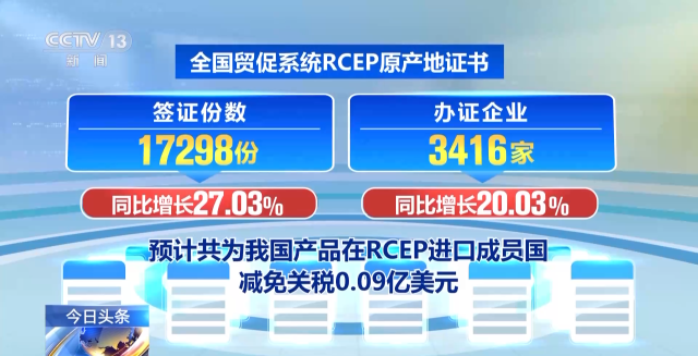 中國貿促會8月30日介紹:今年7月份,全國貿促系統(tǒng)累計簽發(fā)原產地證書等各類證書54.62萬份,較上年同比增長12.82%。全國貿促系統(tǒng)RCEP原產地證書簽證份數為17298份,同比增長27.03%;辦證企業(yè)3416家,同比增長20.03%,預計共為我國產品在RCEP進口成員國減免關稅0.09億美元。