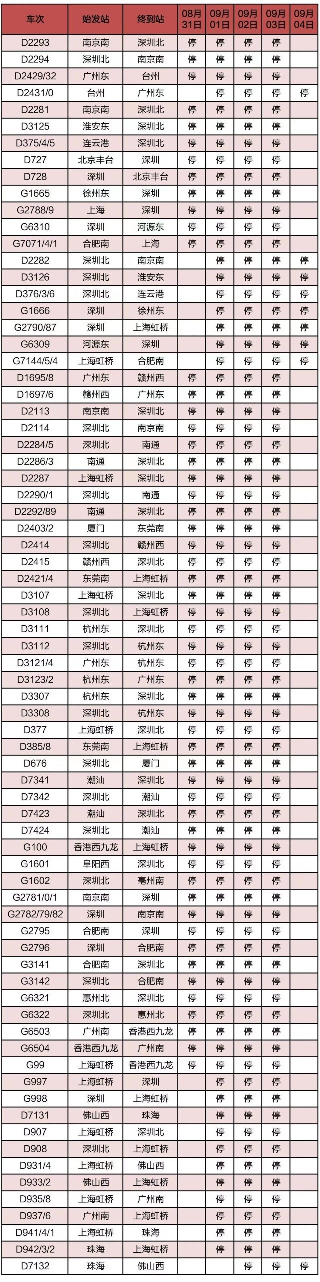 “長三角鐵路”消息:受第9號臺(tái)風(fēng)“蘇拉”影響,為確保列車運(yùn)行安全,鐵路部門計(jì)劃對杭深線、京港高鐵、廣深城際、廣深港高鐵、穗深城際、京九線等線路運(yùn)行的部分列車采取停運(yùn)措施,計(jì)劃停運(yùn)8月31日至9月6日間共121趟旅客列車:其中停運(yùn)動(dòng)車組列車74趟,停運(yùn)普速列車47趟。(停運(yùn)列車車次信息見附表)