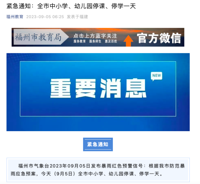 中國(guó)青年報(bào)客戶(hù)端福州9月5日電(中青報(bào)·中青網(wǎng)記者 田宏煒)今天早上6時(shí),福州市教育局緊急通知,根據(jù)福州市防范暴雨應(yīng)急預(yù)案,全市中小學(xué)、幼兒園停課、停學(xué)一天。
