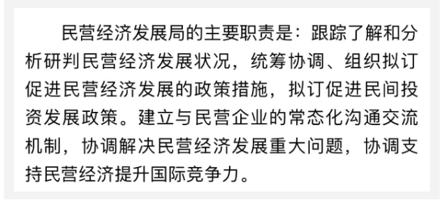 我們注意到,也有個(gè)別人擔(dān)心設(shè)立這個(gè)新機(jī)構(gòu),民營(yíng)企業(yè)是不是多了一個(gè)管理者?這個(gè)擔(dān)憂可以打消。你看,“官宣”的民營(yíng)經(jīng)濟(jì)發(fā)展局主要職責(zé),著眼于統(tǒng)籌協(xié)調(diào)、綜合施策、促進(jìn)發(fā)展,而沒(méi)提一個(gè)“管”字。