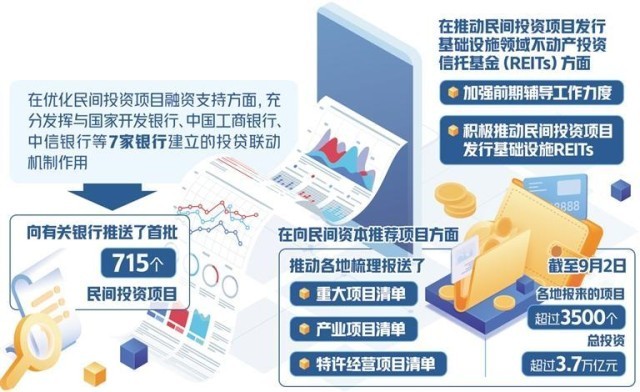 為貫徹落實(shí)《意見》,國家發(fā)展改革委印發(fā)了《關(guān)于進(jìn)一步抓好抓實(shí)促進(jìn)民間投資工作努力調(diào)動民間投資積極性的通知》,提出了17項(xiàng)有針對性的具體措施。據(jù)介紹,在優(yōu)化民間投資項(xiàng)目融資支持方面,充分發(fā)揮與國家開發(fā)銀行、中國工商銀行、中信銀行等7家銀行建立的投貸聯(lián)動機(jī)制作用,向有關(guān)銀行推送了首批715個民間投資項(xiàng)目,請有關(guān)金融機(jī)構(gòu)按照市場化、法治化原則,自主選擇符合條件的項(xiàng)目給予金融支持。在向民間資本推薦項(xiàng)目方面,推動各地梳理報送了重大項(xiàng)目清單、產(chǎn)業(yè)項(xiàng)目清單、特許經(jīng)營項(xiàng)目清單。截至9月2日,各地報來的項(xiàng)目超過3500個,總投資超過3.7萬億元。在推動民間投資項(xiàng)目發(fā)行基礎(chǔ)設(shè)施領(lǐng)域不動產(chǎn)投資信托基金(REITs)方面,加強(qiáng)前期輔導(dǎo)工作力度,積極推動民間投資項(xiàng)目發(fā)行基礎(chǔ)設(shè)施REITs。近日,國家發(fā)展改革委向證監(jiān)會推薦了金風(fēng)科技風(fēng)力發(fā)電項(xiàng)目,這是推薦的首單民間投資清潔能源REITs項(xiàng)目。