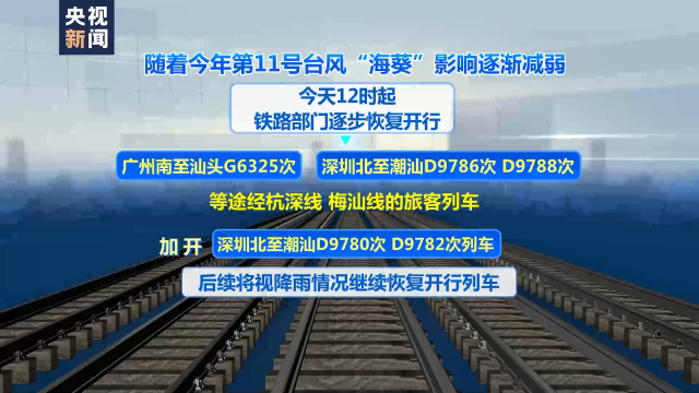 隨著今年第11號(hào)臺(tái)風(fēng)“??庇绊懼饾u減弱,5日12時(shí)起,鐵路部門逐步恢復(fù)開行廣州南至汕頭G6325次、深圳北至潮汕D9786次、D9788次等途經(jīng)杭深線、梅汕線的旅客列車,加開深圳北至潮汕D9780次、D9782次列車。后續(xù)將視降雨情況,繼續(xù)恢復(fù)開行列車。
